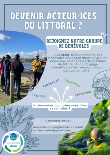 L’ULAMIR-CPIE recherche des bénévoles pour constituer un groupe dédié aux sciences participatives du littoral. Vous aimez le bord de mer et souhaitez contribuer à la protection de sa biodiversité ? Aucun bagage scientifique n'est requis, juste un peu de curiosité !N'hésitez pas à nous contacter pour plus d'informations.
